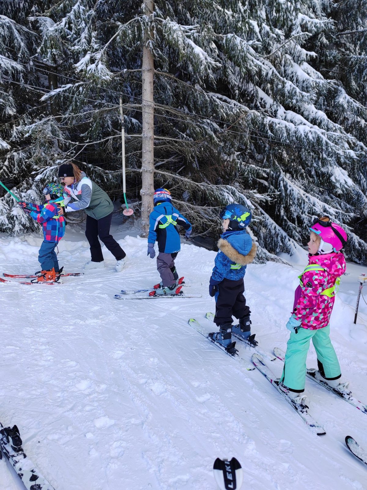Dnes jsme opět všichni trénovali na svahu za chalupou. Děti, které včera staly poprvé na lyžích, dnes již sjížděly sjezdovku u chalupy a dokázaly vyjet na vleku. Všichni dělají velké pokroky a lyžování jim jde.